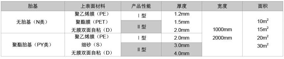 是以自粘聚合物改性瀝青為基料,采用無胎基(非外露使用)或聚酯胎基增強,以聚乙烯膜、聚酯膜、細砂為上表面材料或無膜雙面自粘,并覆以隔離膜(或紙)而制成的本體自粘防水卷材。